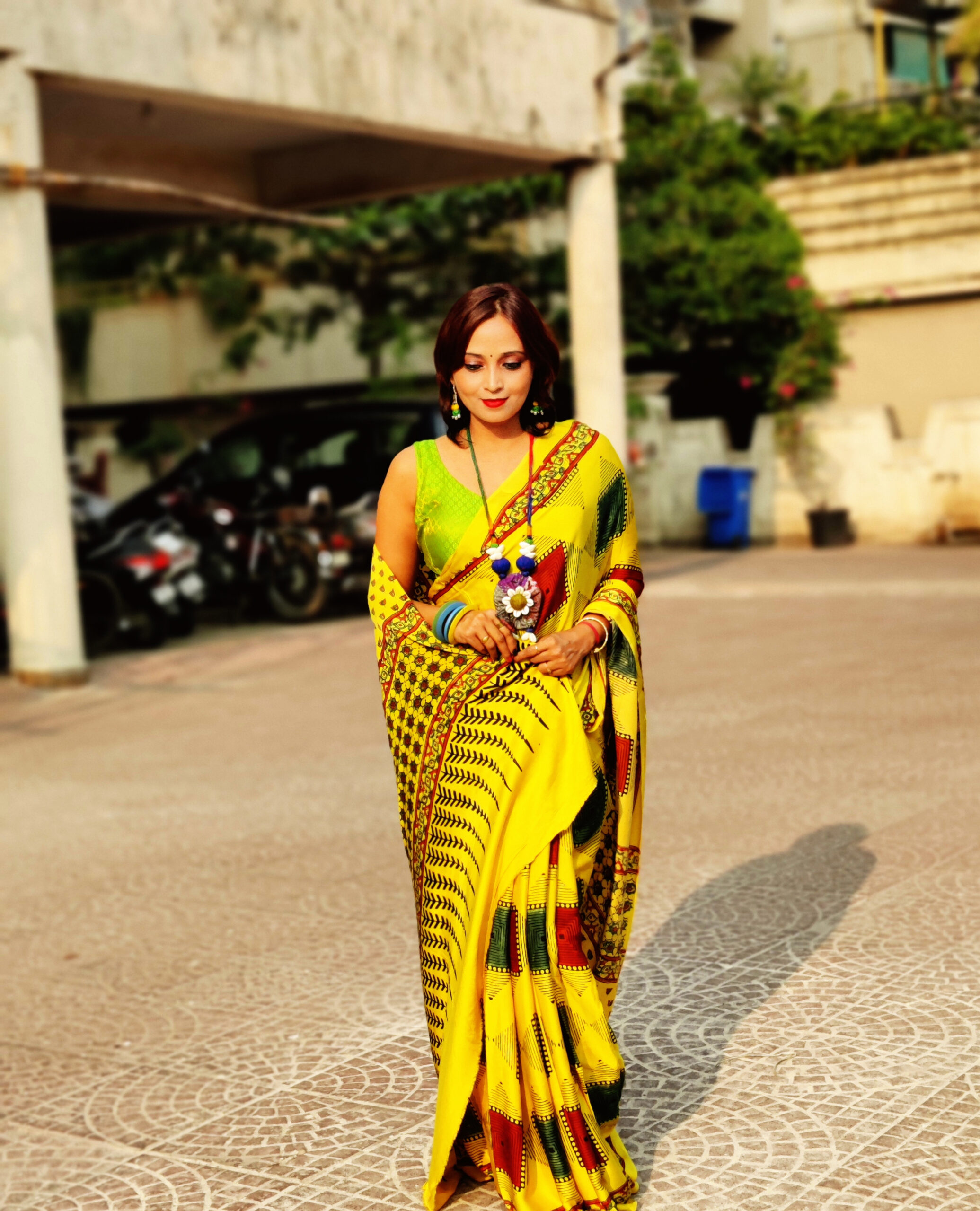 Saree: Handcrafted Ajrakh modal silk saree with intricate geometrical patterns using all natural dyes. Modal silk is a blended knitted fabric achieved through interlacing modal fibers and silk yarns.