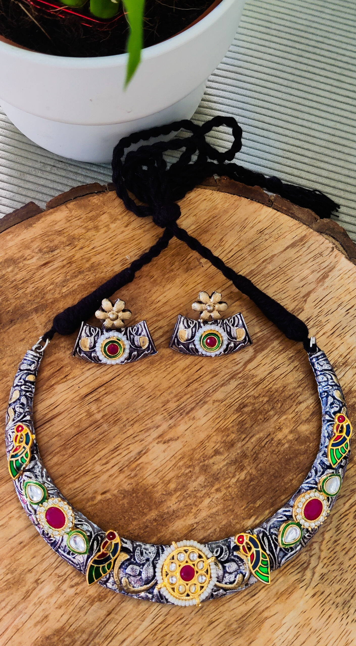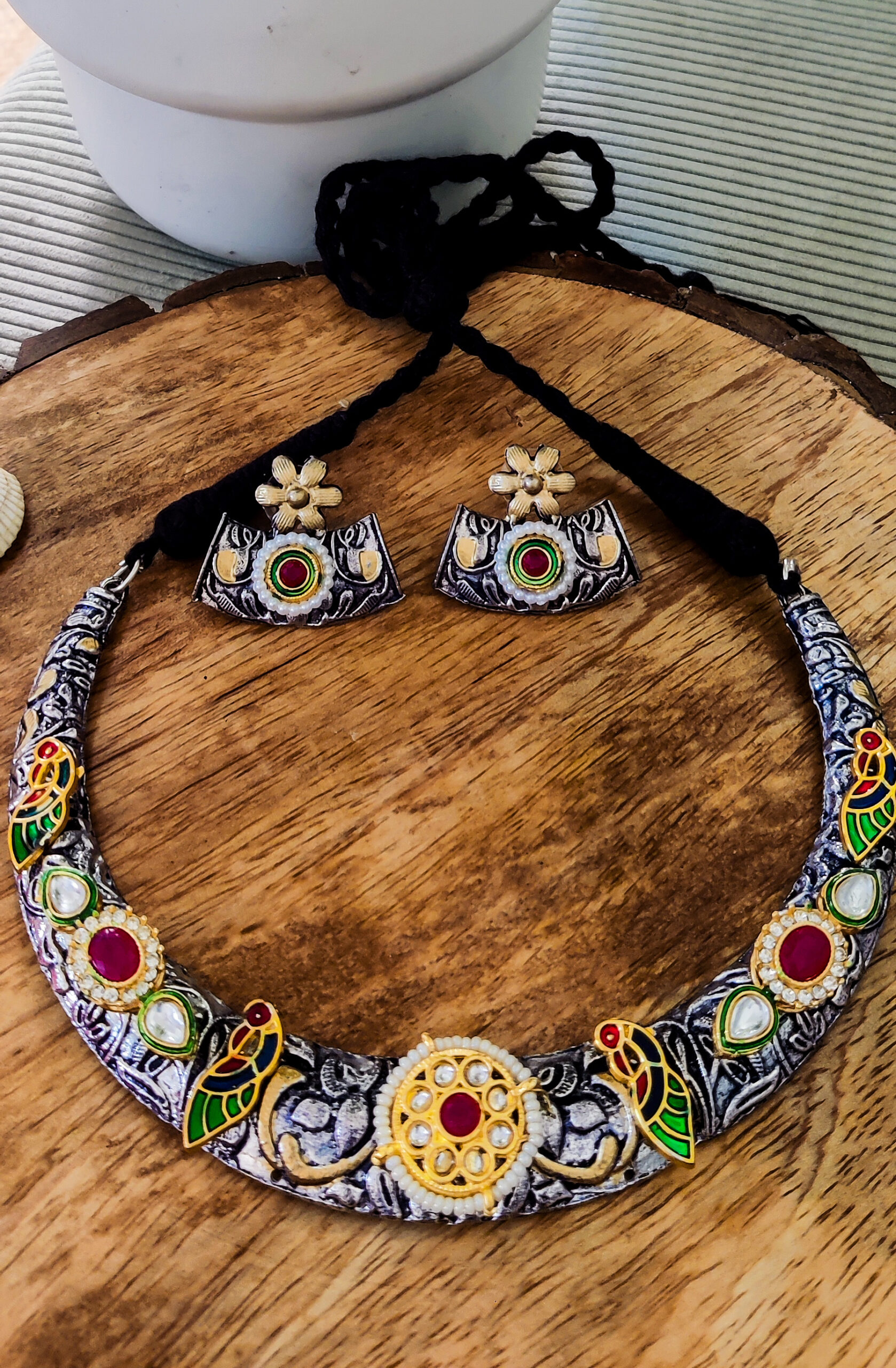 Make a lasting impression with our silver lookalike necklace and earring set. Inspired by heritage designs, this statement set is perfect for weddings, pujas, and festive occasions—where tradition meets modern comfort.
