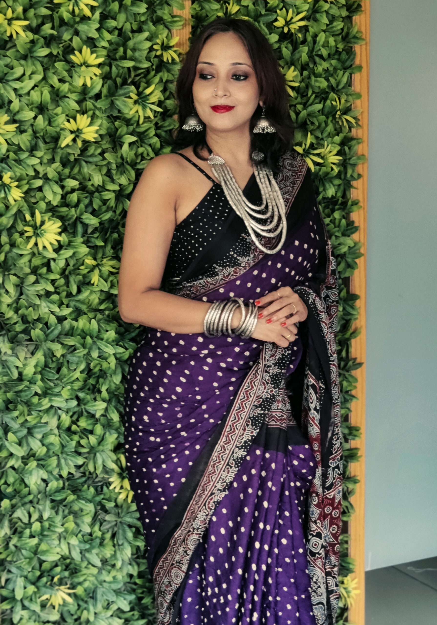 These sarees are a mesmerizing fusion of two traditional Indian textile arts, the intricate Ajrakh hand-block printing and the vibrant Bandhani tie-dye, creating a textile masterpiece with a story in every thread.