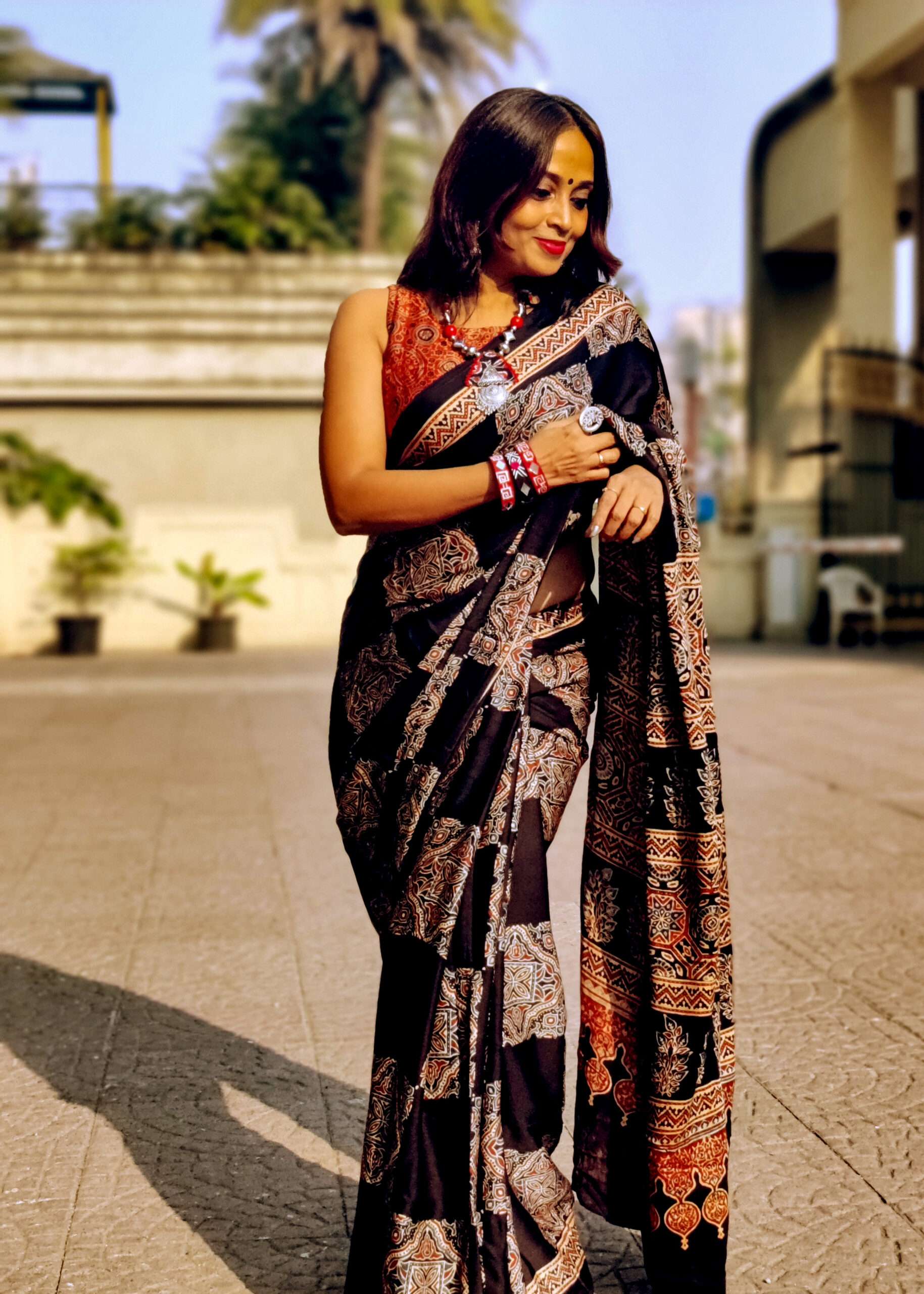 Saree: Handcrafted Ajrakh Modal Silk Saree.